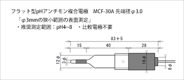 上の写真のアンチモン複合電極:MCF-30Aはセンサー形状がフラットでスリーブタイプとなっており、試料表面のpH測定が可能です。