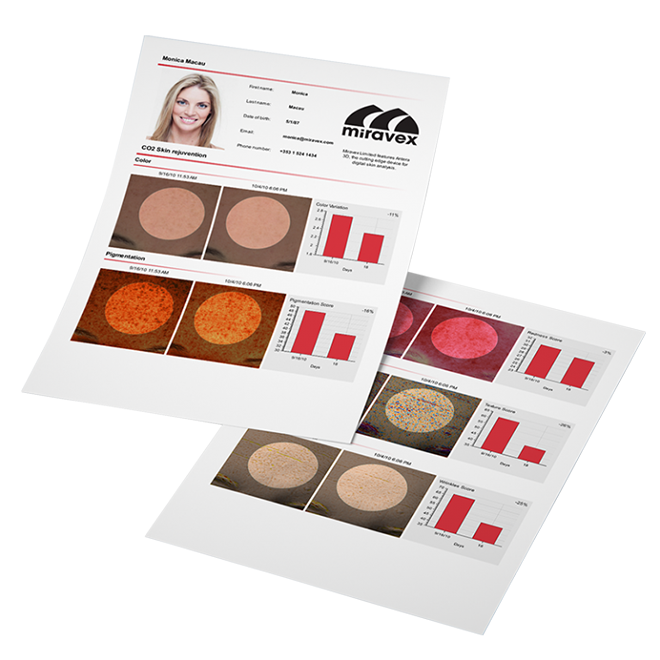 - 高度な光学技術により、皮膚表面のイメージだけでなく、ヘモグロビンやメラニン、テクスチャー、シワの変化を、2D・3Dイメージでグラフィカルに再現。さらにスキャンデータを定量化したレポートを作成することで、正確な分析・評価をサポートします。